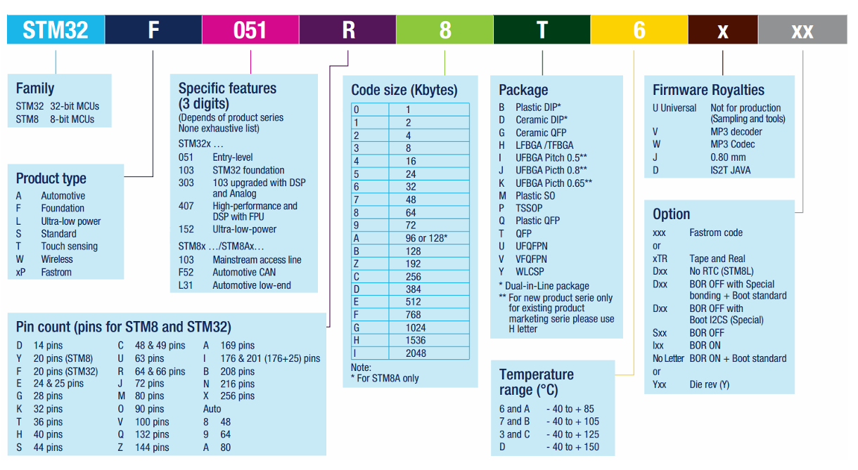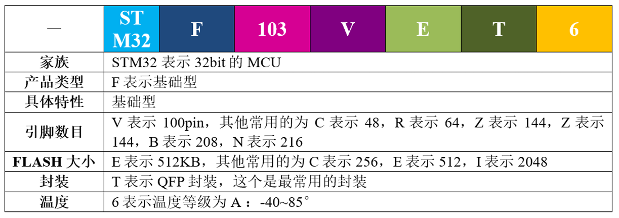 - 以野火F103指南者使用的STM32F103VET6来介绍STM32的命名方法: