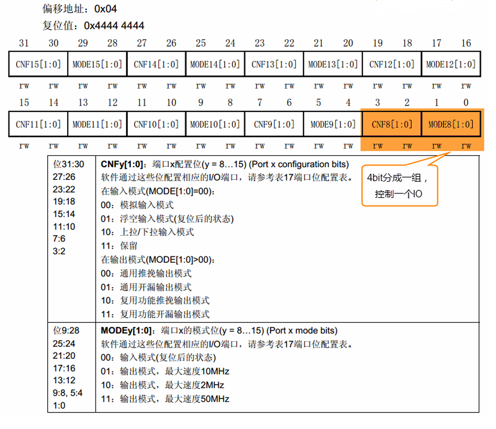 在GPIO外设中,控制端口高低控制寄存器CRH和CRL可以配置每个GPIO的工作模式和工作的速度,每4个位控制一个IO,CRH控制端口的高八位,CRL控制端口的低8位,具体的看CRH和CRL的寄存器描述。