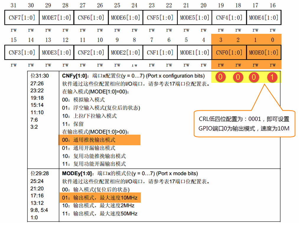 - 首先我们把连接到LED灯的GPIO引脚PB0配置成输出模式,即配置GPIO的端口配置低寄存器CRL,MODE位用来配置输出的速度,CNF位用来配置各种输入输出模式。在这里我们把PB0配置为通用推挽输出,输出的速度为10M。