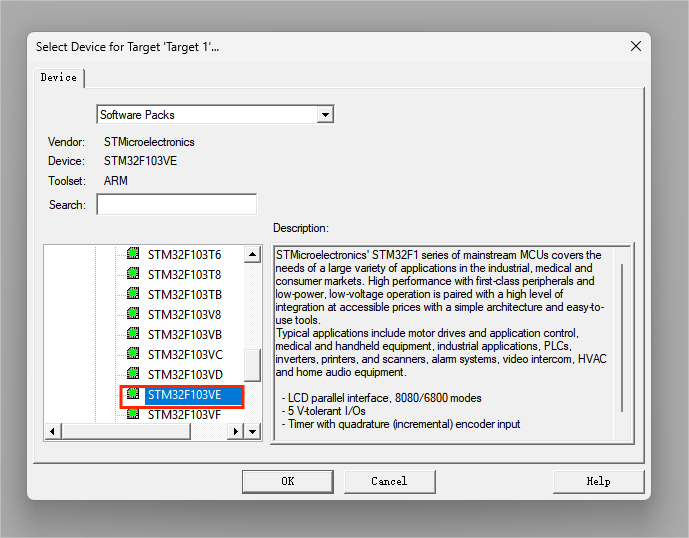 - 选择STM32F103VE型号,选择完后,跳出的在线添加库文件窗口可以直接关掉,因为这个工程用不到。