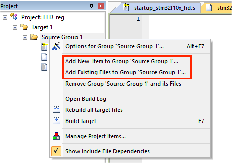 - 添加文件,右键source group 1可以选择导入已有文件或者创建新文件。