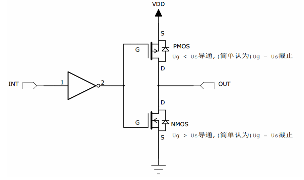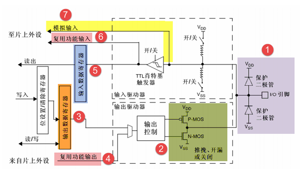GPIO引脚线路经过两个保护二极管后,向上流向“输入模式”结构,向下流向“输出模式”结构。 - P-MOS 管和 N-MOS 管: