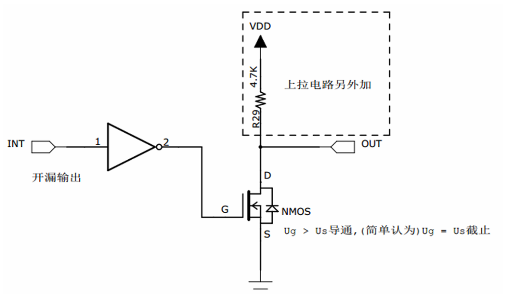 开漏输出模式,上方的P-MOS管完全不工作。如果我们控制输出为0,低电平,则P-MOS 管关闭,N-MOS管导通,使输出接地,若控制输出为1(它无法直接输出高电平),则P-MOS 管和N-MOS管都关闭,所以引脚既不输出高电平,也不输出低电平,为高阻态。正常使用时必须外部接上拉电阻,它具有“线与”特性,也就是说,若有很多个开漏模式引脚连接到一起时,只有当所有引脚都输出高阻态,才由上拉电阻提供高电平,此高电平的电压为外部上拉电阻所接的电源的电压。若其中一个引脚为低电平,那线路就相当于短路接地,使得整条线路都为低电平,0伏。